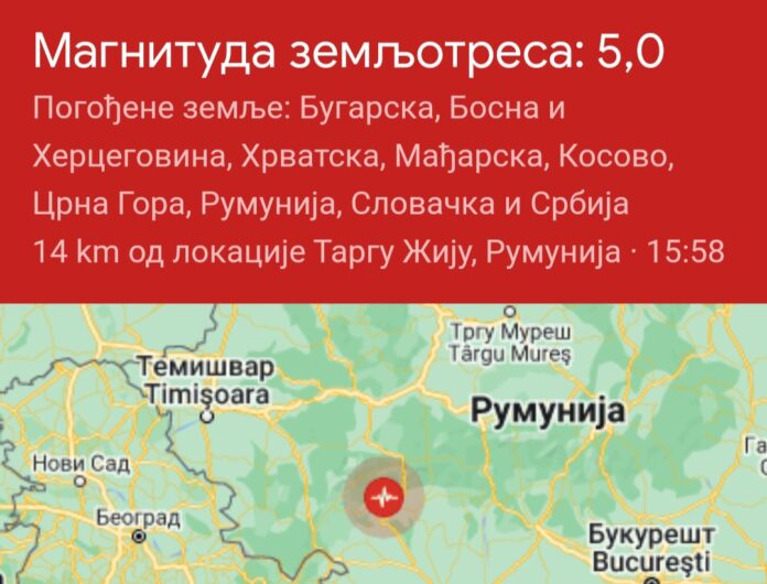 Zemljotres jačine pet stepeni Rihterove skale danas oko 16 sati dogodio se u Rumuniji. Potres se osetio i u Srbiji.
