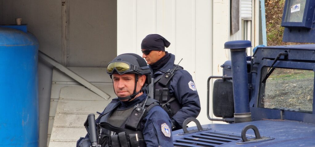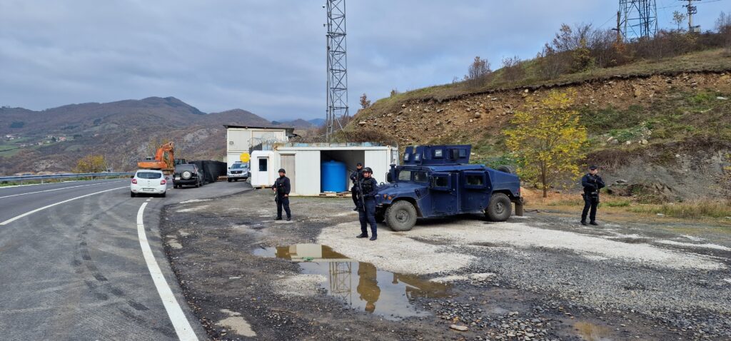 Pripadnici Specijalne jedinice policije na Kosovu “Rosu” nalaze se na magistralnom putu kod Jarinja u blizini administrativnog prelaza.