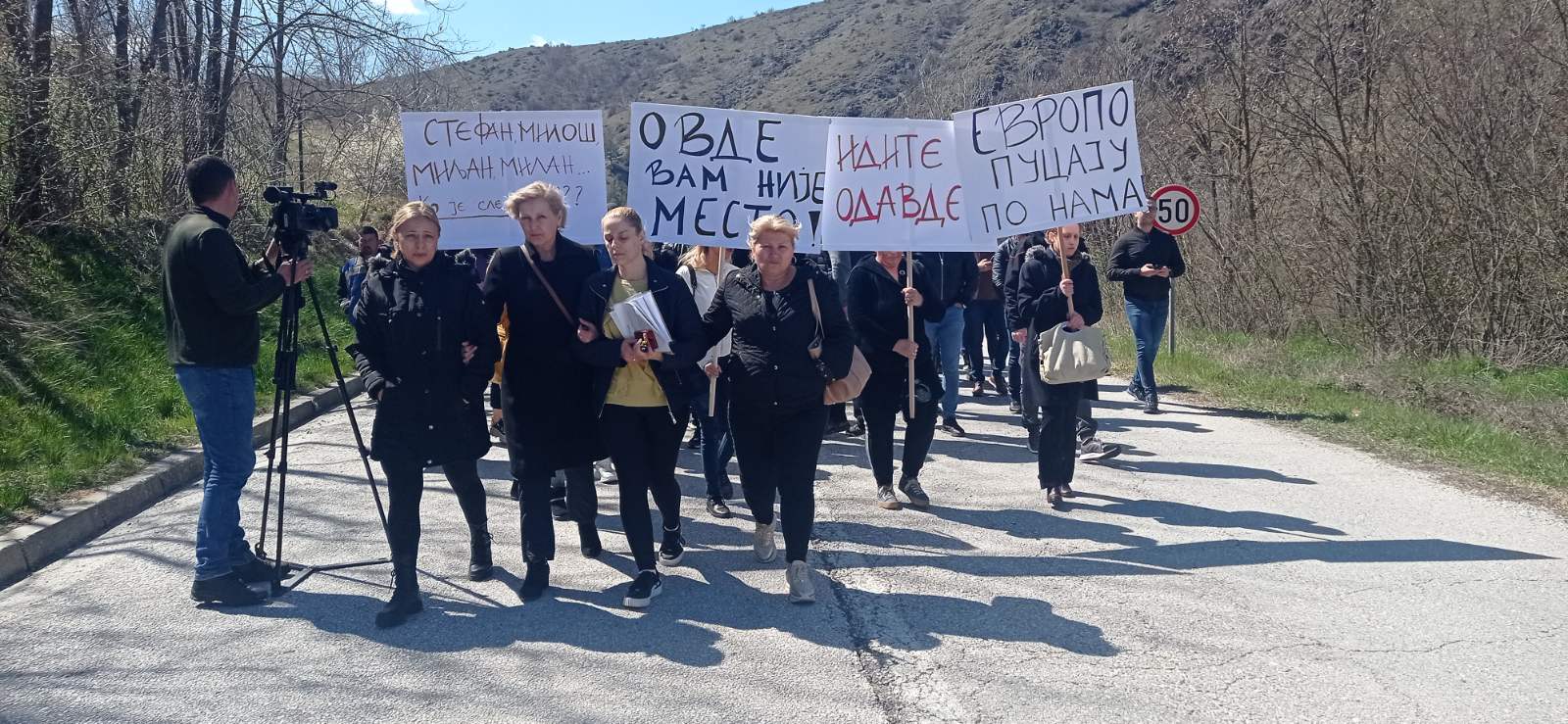 Okupljeni građani došli su glavnim putem Zvečan-Raška i nosili su transparente na kojima piše “Idite odavde”, “Evropo pucaju na nas”, “Ovde vam nije mesto”.