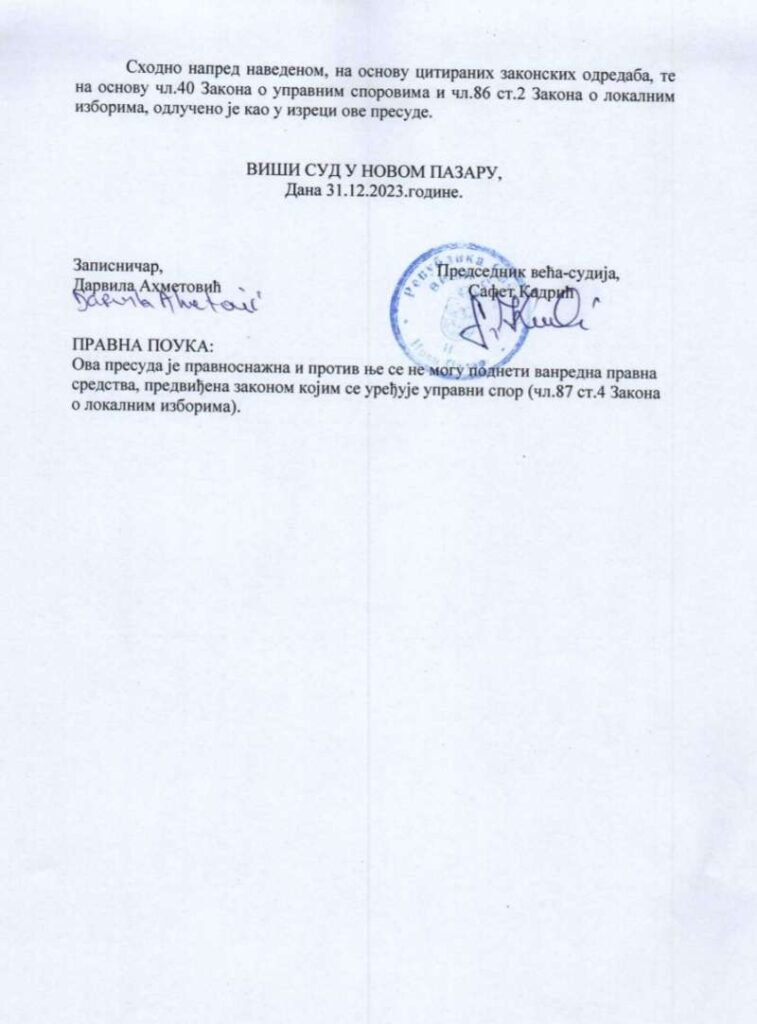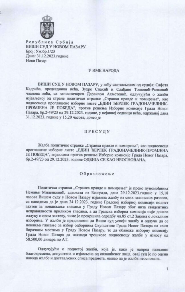 Viši sud u Novom Pazaru odbacio je žalbu SPP kojom je ova stranka tražila poništenje izbora u ovom gradu.